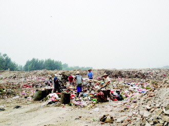臭味令人作呕的垃圾处置场里,十多位村民在翻捡垃圾。