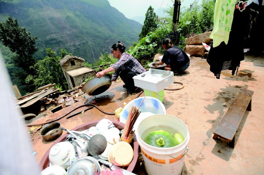 ▲林清山的妻子(左一)是个闲不住的人,大伙吃完饭她就忙着洗刷锅碗。