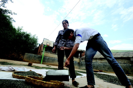 ▲老林的小儿子帮母亲收拾花椒。