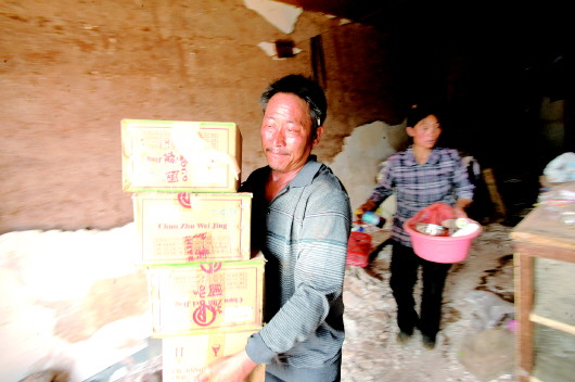 ▲老林两口子从自家危房里抢出生活用品。