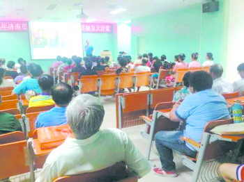 ◥8月8日全民健身日,泉城健身大讲堂里听课的多是老年人。 本报记者 孟燕 摄