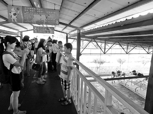 参观团成员被奶牛场的环境吸引留影 本报记者 李钢 摄