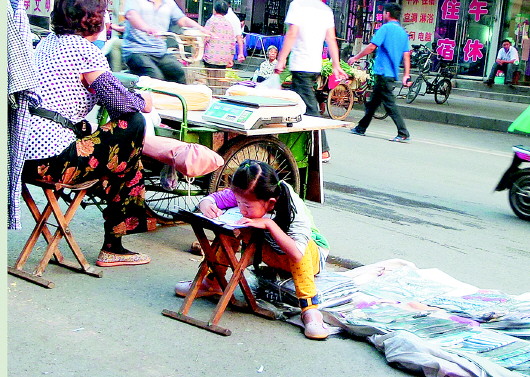 街头,人来人往,熙熙攘攘,但经常会发现一些孩子在安心做作业。这个小女孩所有的学习工具都很简陋,但她那股认真劲儿却是一流的。