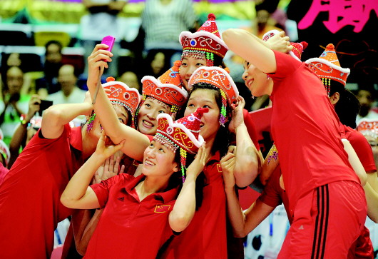 8月10日,世界女排大奖赛香港站的比赛中,郎平率领的中国队以3:1战胜意大利队,从而以3战全胜的成绩获得本站冠军。图为女排队员在领奖台上自拍留念。 新华社记者 卢炳辉 摄