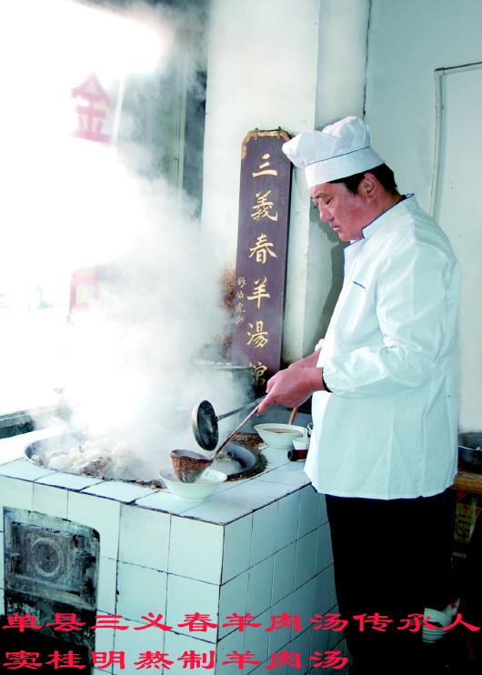 三義春的羊汤熬制秘方从不保密,在三義春的传承人看来,若是羊汤从业者都能按照这样的流程做汤是一份荣幸,他们在原料的购进上也是内行,对所需要的原料,如山羊,只要在羊背上抓一把就可测出大概能出多少肉、多少下水。连佐料中的最不起眼的桂皮、良姜、川芷、草果等,植入前都要耐心打磨干净。80多年的品牌传承中,“三義春”商标还曾遭遇河南商丘一家快餐店抢注,“三義春”的第二代传人窦桂明为之打了四年的官司,最终为“三義春”正名。“从这事之后我们才知道要注重品牌保护与宣传。”窦桂明介绍,为了能够让更多的人学习、了解“三義春”羊肉汤的制作手艺,十年之前,2004年开始,他们组建了全国“三義春”羊汤网络,招收学徒、传授技艺。对于不少人的好奇:羊肉汤如此纯正,还与添加剂无关,窦桂明揭秘说,熬制过程,大火攻,小火稳,最重要的就是翻锅,要求主厨一定要勤快,不停地清渣除杂,这样待老汤成矣,入碗的羊肉汤才是一锅不含杂质的纯正乳白色羊肉汤。那煮羊肉的老汤是否须用单县本地的地下水?窦桂明明确回答:只要是氟含量低于5%的地下水皆可,味道是否纯正,皆在佐料配比上。如今全国各地的“三義春”加盟店已经有700多家,东到建三江,西到克拉玛依,南到中山,北到呼伦贝尔,全国各地除港澳台外几乎都有。去年6月份,“三義春”被认定为山东省非物质文化遗产、“山东老字号”,在“三義春”的传承人看来,羊肉汤手艺作为祖辈的心血如今更是文化的一部分。