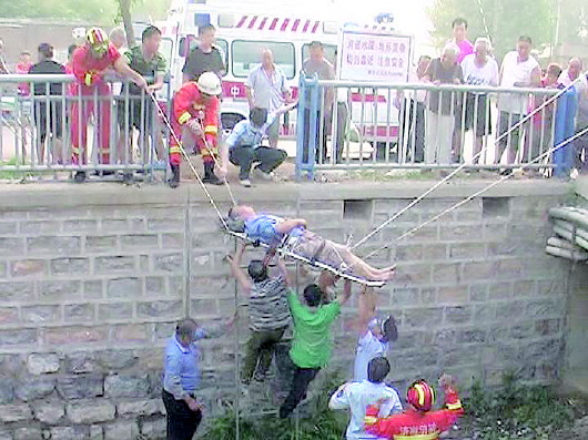 热心的群众拨打了110、120、119报警电话求救,同时通知杨先生家人。最后,在消防、民警、医护人员和热心群众的共同努力下,杨先生被固定在担架上,担架两端系上了绳子,大家一起发力,把他安全抬上了岸,送到医院治疗。