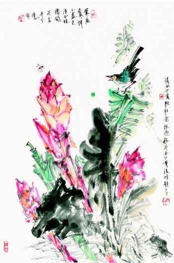 徐峰在采访中还谈到了自己的花鸟画创作理念,他认为:只注重技法的画面不可能感人,因为感人的不是技法而是情感和境界,只有意境才是花鸟画的灵魂,才是画家通过自然之景来抒发自己的情感,通过笔墨来形成画面。只有这样,才能使画家、画作与读者形成强烈的艺术共鸣,从而产生出具有艺术感染力的意象。他笔下的花鸟画色彩纯净,下笔利落,观者看后总能联想到春暖花开的季节,百花争艳,鸟儿欢唱,把自然之美、形式之美、情趣之美、寓意之美融为一体,使人在观赏之际得到了一种美的享受。而这些西双版纳的花卉写生作品,根植于西双版纳的独特花卉植被,又融入了自己对花卉和笔墨的理解。巨大而颜色明丽的花冠,添加了主观意识从而变得夸张的绿色枝叶,都在阳光下用力伸展,,体现出了生命的张力与姿态。 (贾佳)