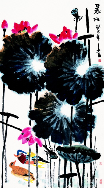 邢少臣本次参展的多幅大写意花鸟画,是2013年创作的最新力作,代表了其追求大写意花鸟画的新突破。其中,作品《一食可得千万寿》以虚实结合的笔法写枝干,以不经意的笔法圈点花瓣,富丽雄奇,拙朴大气。整幅作品富有层次感,显示出干湿浓淡的笔墨变化。《大吉图》中公鸡的头部显露精神,颈部灵活,翅膀和胸腹墨色浑厚,一个英姿飒爽、意气焕发的公鸡形象跃然纸上,让观者眼前一亮。《富贵神仙》落笔劲健,纵横驰骋,不拘于笔墨而有气势,重色与彩墨结合,颇有趣味。邢少臣走笔过程的连续性让人一目了然,即使不注重画面里具体的形象,画作中那些抽象的走笔也给人很强的感染力,正是具备了这样雕塑式的绘画语言,让邢少臣在大写意花鸟画的路途上越走越开阔。