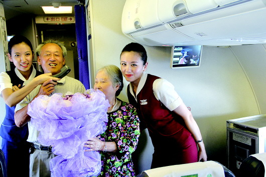 8月2日,农历七月初七,正值传统佳节“七夕”。山航客舱部青岛大队杨雅梦乘务组以“七夕鹊桥会,相逢在客舱”为主题,在南京至昆明的航班上与173名乘客共同度过了一个别开生面的七夕会。“相约七夕,大声说爱”环节是本次特色活动的亮点之一。一位8岁的小男孩背诵了描写“七夕”的古诗,并在全体旅客的掌声下把鲜花送给了一对于1958年结婚的老人,让年迈的老人第一次收到了七夕节的礼物,同时给所有机舱内的有情人送去了祝福。