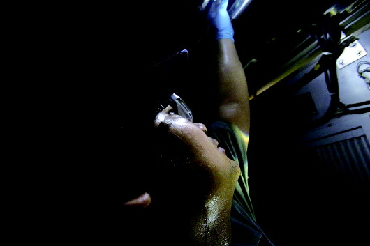 虽然是在夜间,温度较白天稍有降低,但是记者在检修库戴着安全帽待了15分钟左右就已经汗如雨下。车底部有散热系统,因此夏天的温度通常很高,检修人员更是脸上全是汗珠,衣服紧贴在身上。他们拿着检修工具在车下一边“蒸桑拿”,一边要坚持“必看、必听、必闻、必指”的四必作业法进行检查。在动车底部一个一个零部件“摸”过去,检修人员大约用了5分钟才检查完一节车厢。