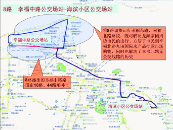 调整理由:龙海家园小区居民入住率大幅提升,市民出行需求越来越高,而现8路运行的幸福中路路段,因市民搬迁,客流大幅下降,同走向的18路完全可以满足原在幸福中路乘坐8路市民的出行需求。