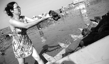 10日,在第一海水浴场,工作人员正在清理沙滩上的礁石,一些在此玩耍的游客也加入到清理工作中。