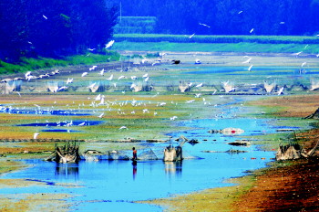8月10日,减河上游卅里铺大桥附近的近十公里河道干涸,不少市民在河道内的浅水里捕鱼。