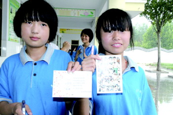 留守儿童精心制作的留言卡,一面是留言,另一面是志愿者照片。