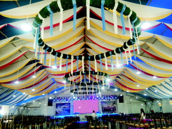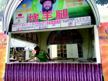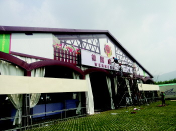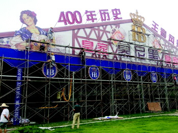 10日,啤酒城中不少啤酒大棚正在进行装修。
