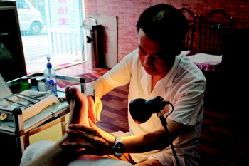 来找徐希军修脚的顾客多数有甲沟炎,病情严重的,进门时甚至是一瘸一拐。进店后,徐希军仔细观察指甲走向、询问顾客疼痛部位,一刀就能清除嵌入脚趾的指甲。“这不是什么技巧,这是修脚多了后,积累出来的经验。”徐希军说,修脚下刀深浅难掌握,弄不好会给顾客划破脚,他也是从多次失误中总结出的教训。