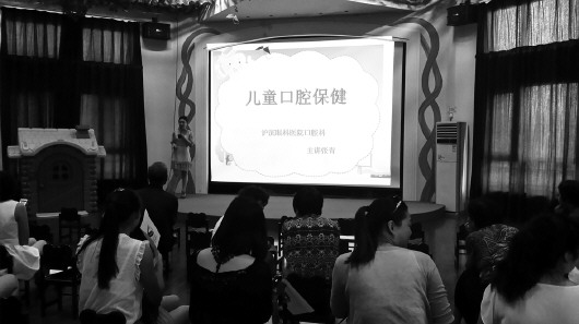 沪滨口腔科医生为格林城堡幼儿园大班孩子的家长们讲解口腔保健知识。