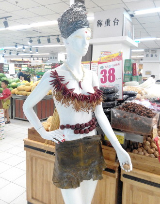 时间:2014年8月3日 自述:一商场为促销,将一模特身上挂满了辣椒、枣、莲子、黄花菜、海带等,成为一名“植物人”。 点评:超市大妈又发挥想象力了。