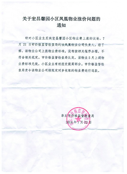 旁边另一位业主告诉记者,“7月22日,章丘市价格监督检查局在小区内张贴了通知,明确指出涨价不符合正常程序,可是没过多久听说被物业公司的工作人员撕了,这也太不尊重我们业主的利益了。”