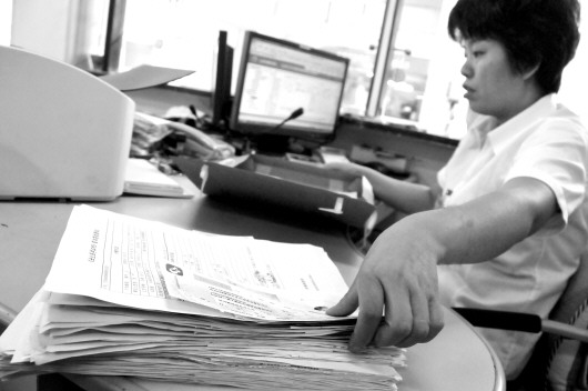 ◤13日,在济宁妇女儿童医院,工作人员将办理好的出生证明装进档案袋。 本报记者 张晓科 摄