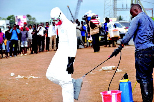 8月12日,在利比里亚首都蒙罗维亚,一名医疗人员接受消毒剂喷洒。 新华/美联