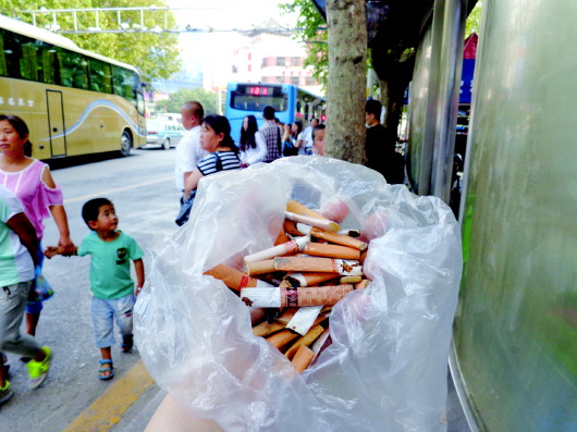 “一天捡多少个烟头真不知道,数也数不清。”附近的环卫工冉先生说,反正一个小时不打扫就遍地是烟头了。“没法劝人家不抽烟,等车烦了累了抽支烟能理解,但可别乱扔烟头。有的人烟头没熄就往垃圾桶里扔,烧坏了垃圾桶。”