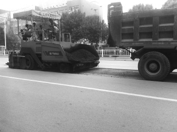 13日上午,建设东路主干道南侧多处破损路面已破开,由于路面破损严重,一些破开的路面长达数十米。市政处工作人员清理完破开后的路面后,用摊铺机铺设沥青,同时用压路机压实。“建设路主干道破损较厉害,路上大面积坑洼较多,把坑洼破开重新上油铺设沥青,修好后路况要比原来好得多。”