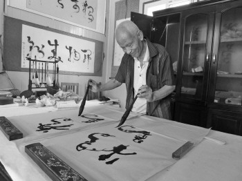 8日上午,亓玉宝一个人在家中伏案习书。“书法是我生活中一个不可缺少的部分,每天都要练习十多个小时。”走上艺术道路的亓玉宝,六十年如一日练习书法。已经74岁高龄的他,仍然笔耕不辍,每天都要到书房练上一把。记者在亓玉宝居住的几间平房内看到,墙壁上挂满了亓玉宝的书法作品,家里温馨典雅。