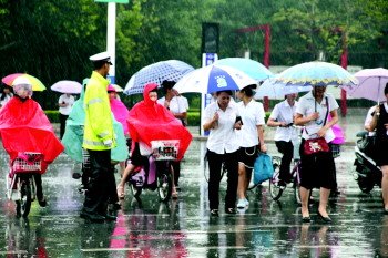 ▲8月13日上午的一场降雨,正值上班高峰期,在湖滨中大道和东风路十字路口,德州市交警支队直属一大队民警冒雨维护交通秩序。