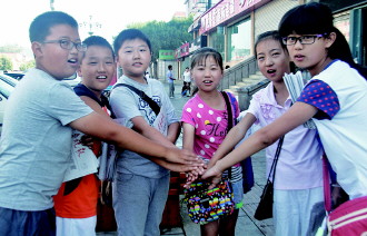13日,利群卖报点的小报童们在一起互相加油打气。卖报进入了白热化的冲刺阶段,小报童们互相鼓励,坚持就是胜利。