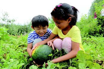 小伙伴们正在地里摘西瓜。 本报记者 王鸿哲 通讯员 张大伟 摄