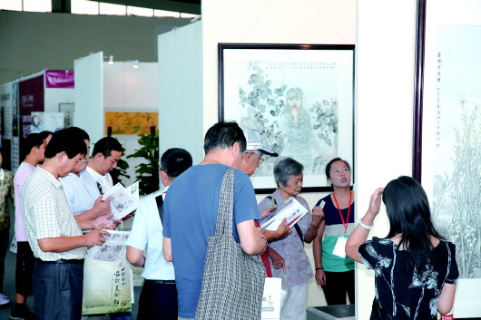 14日上午,济南舜耕国际会展中心,观众在名家画作前驻足观赏。当天,第七届山东国际大众艺术节暨第六届中国书画名家精品博览会拉开帷幕。其中大众艺术节将举办52项活动打造文艺“嘉年华”,而作为艺术节活动之一的名家精品博览会,集纳了20多个省份著名画家的数百幅作品,为大众呈现出异彩纷呈的国画艺术流派。 本报记者 李振存 摄