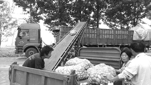 曲阜李振银的家庭农场的工人将土豆装车卖到郑州。