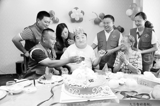 王金龙(前左一)与志愿者为脑瘫患者过生日。