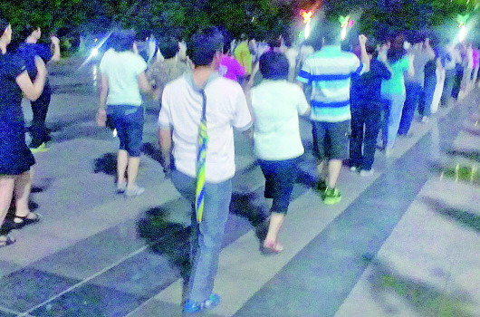 自述:怕下雨,雨伞挂在后衣领上,安心跳着广场舞。