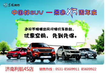 济南利航风行汽车4S店于2014年8月16日将举办中国好SUV—景逸X5周年庆活动,欢迎新老客户莅临展厅参加!东风风行的家用车品牌——景逸,于2007年以“全能大两厢”的产品形象创建,“城市代步家轿”景逸XL与“城市风格家轿”景逸LV等细分新品推出后,以宽敞舒适大空间、直追德系车的高安全性等良好口碑,销量呈现稳定增长的良好态势,博得消费者好评。