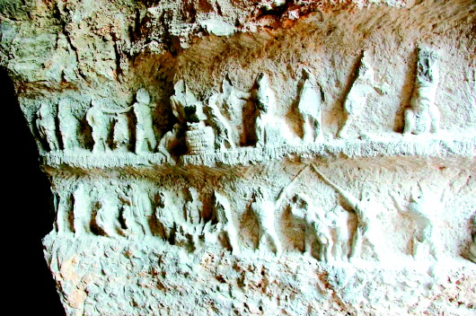 紧挨着这三尊石像稍向里的地方,有上中下三层组成了一铺雕像群,人物造型有24个。而在老虎洞的右侧石壁上也有三层雕像组成的一铺雕像群,其中最下一层只雕刻了半截,而没有像上面两层那样雕刻到头,数量大约在40多尊。
