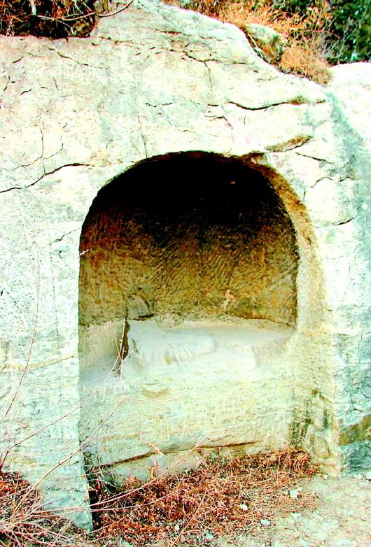 出了老虎洞,向北大约数十米的崖壁上,也有一座石窟造像,内有趺坐造像一尊,也是被人破坏得只剩盘坐的腿脚以及衣服下摆了。