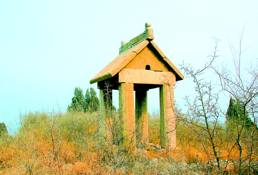 从老虎洞洞口向西攀爬大约七八十米的距离后,基本就到了虎头山的山顶位置。听山下一位姓庄的老人介绍,山顶上应当有一座叫做“圣母殿”的庙宇院落。但很遗憾,山顶上除有一座孤立不倒的石钟亭外,再也见不到任何站立的古建筑,周围只剩下一圈坍塌的围墙,依稀还让人辨认出当年庙宇的轮廓。