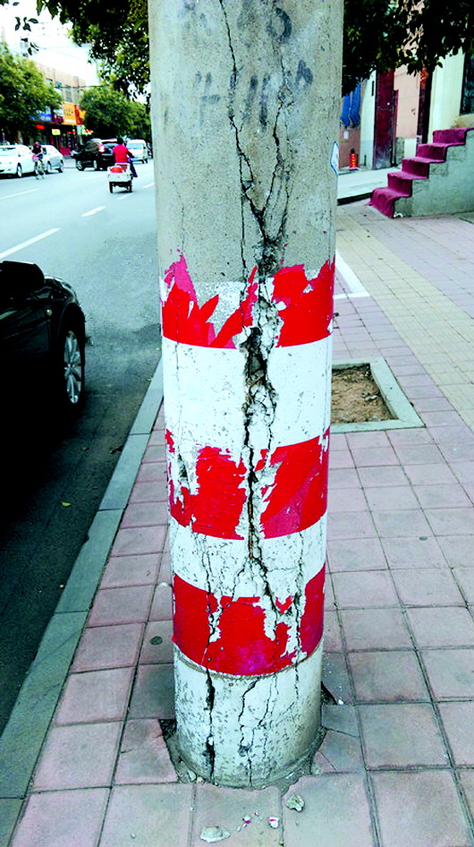 桃花山街其中一处裂缝严重的电线杆。 本报记者 王帅 摄