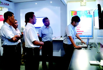 信息化“大篷车”内,政企参观人员体验4G特色业务。 本报记者 于伟 摄