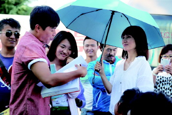 拍摄间隙,陈思诚拿着剧本和袁泉对戏。 本报记者 韩逸 摄