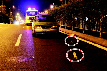 事故现场留着被撞女子的一双高跟鞋(圆圈处)。 曹思扬 摄
