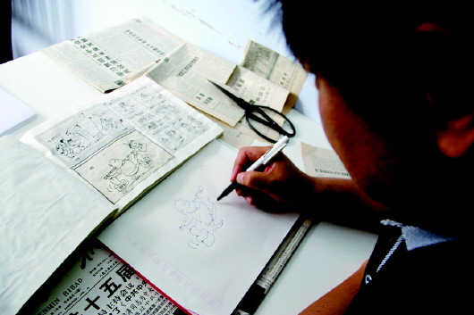 刘荣焕在临摹报纸上的漫画。