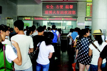 在淄博火车站学生窗口等待买票的人。 本报记者 刘晓 摄