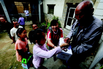 孩子们带着慰问品同安利志愿者看望村子里的高龄老人。