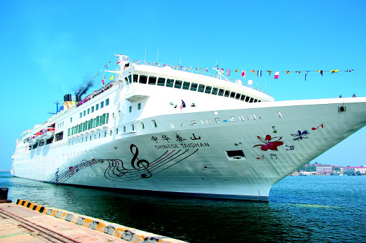 ▲“中华泰山”邮轮船长180.45米,船宽25.5米,总吨位2.45万吨。