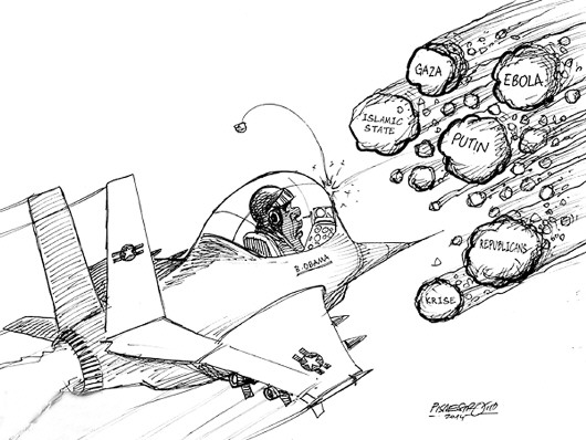 美国总统奥巴马驾驶战机,不料迎面遭遇流星雨,其中的流星包括“加沙”、“埃博拉”病毒、恐怖组织“伊斯兰国”、“普京”、“共和党人”和“危机”。