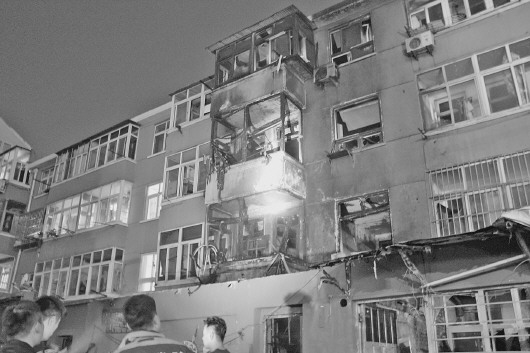 记者看到,事发居民楼外有一排简易房,不少连房顶都没有,起火的就是其中一间。消防队员抢出来两个煤气罐,现场有被炸飞的黑色金属。二单元二、三、四楼阳台和南卧室的窗户全部被烧毁,烧焦的铝合金窗框摇摇欲坠,遍地是焦黑的碎玻璃片。