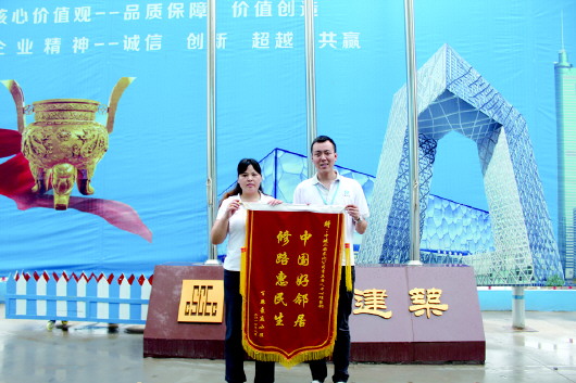 本报8月18日讯(见习记者 张霖) 17日,百脉豪庭居民杨女士来到中建二局承建的章丘唐人中心项目,将“修路惠民生 中国好邻居”的锦旗交到项目书记范坤手中。